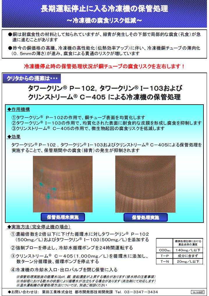 | B⑭ | 緑青除去剤(冷却水系) | タワークリンI,R | 腐食が発生した銅チューブの緑青を除去し、防食する 薬品です。 |