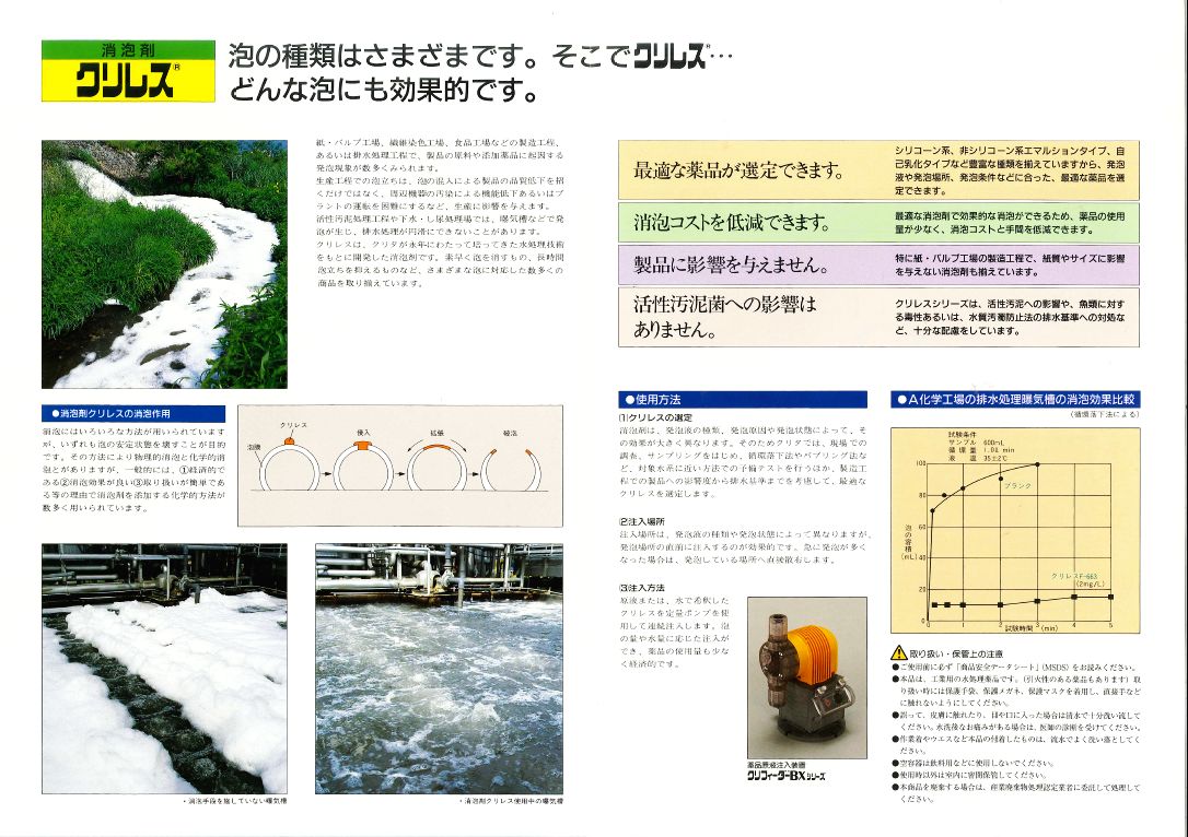 | C⑨ | 消泡剤 | クリレス | 製造・排水処理工程で生じる発泡を素早く消し、 長時間泡立ちを抑える薬品です。 |